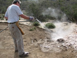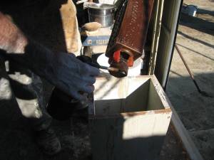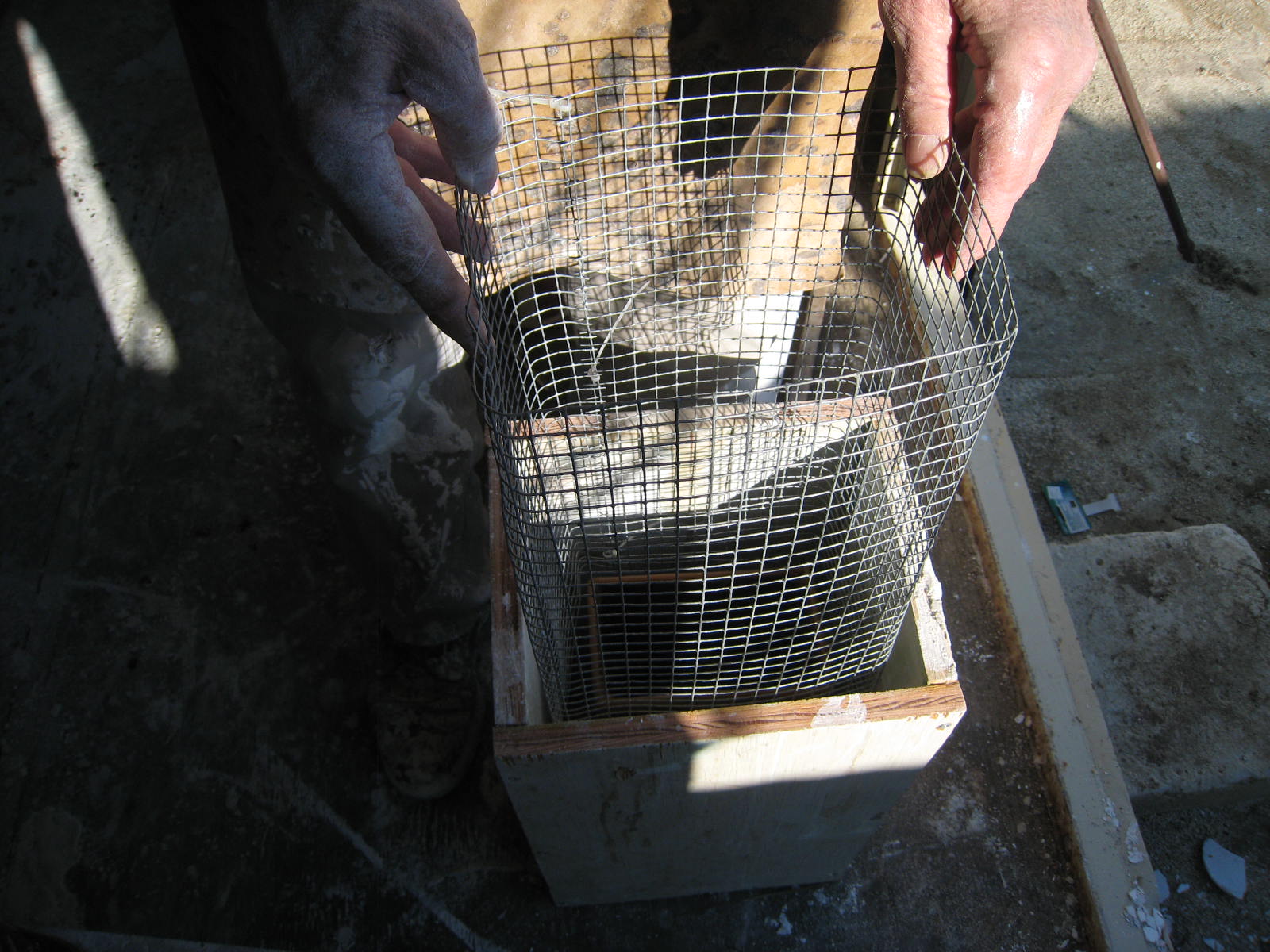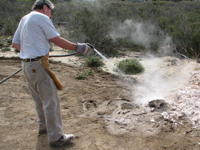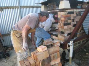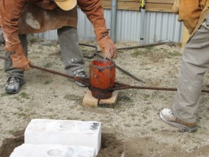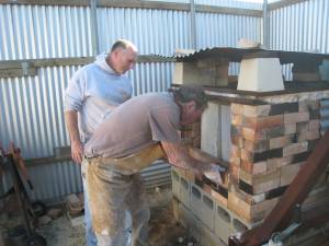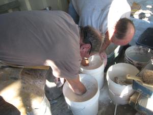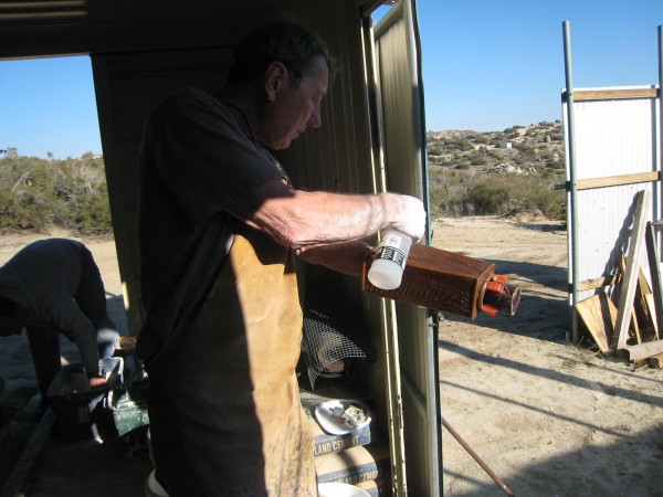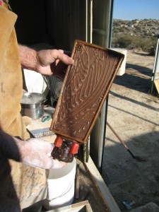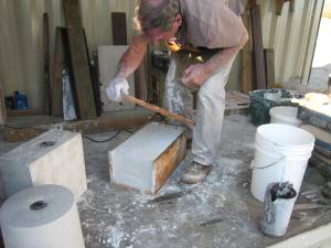 The following images show the process of a bronze pour in 2010. My invaluable assistant was Tom Crowley (Pomona ’86), an artist and sculpture teacher in his own right but, when he comes to Ranchita, still a studio slave. Note that the investments he loads, apparently effortlessly, into the kiln, weigh as much as 150 pounds each. These images begin with a finished wax vessel that’s ready to invest. Later, we’ll add some that document the wax process as well. Hover your cursor over each image for a brief description.