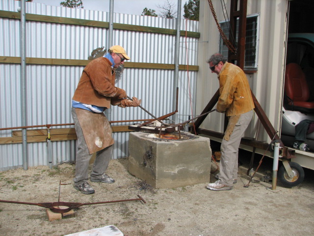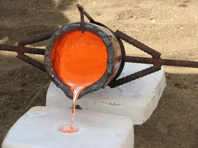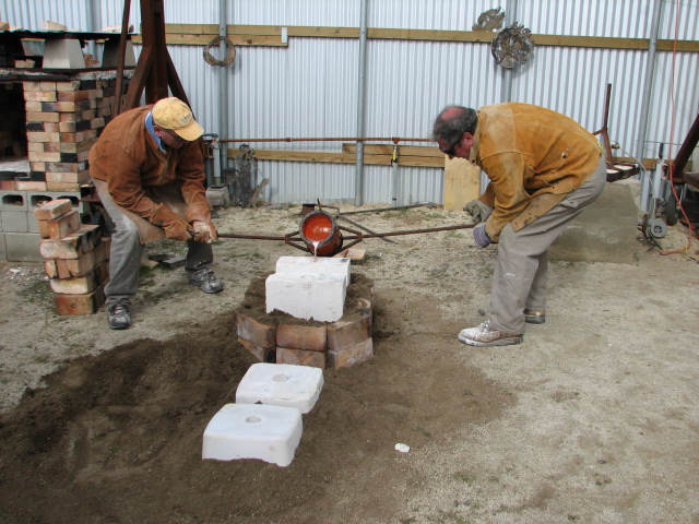 While I (the dutiful wife) have been slaving cluelessly with templates, codes, widgits and plugins, Norm (the artist) has been working on waxes of vessels and platters that, with luck, will soon be bronzes . He will invest the waxes this weekend at Ranchita, and if burnout is successful, the pour will follow. To help you survive the suspense, here are some pictures. These were taken a while back but, frankly, bronze pours all look pretty much alike.